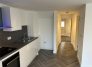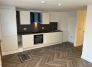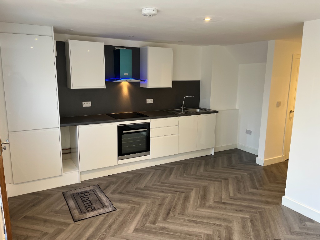 The property features a spacious open-plan kitchen and living area, complete with a stylish fitted kitchen including a built-in Lamona hob and oven, contemporary grey worktops and splashback, white melamine units, and an extractor fan.