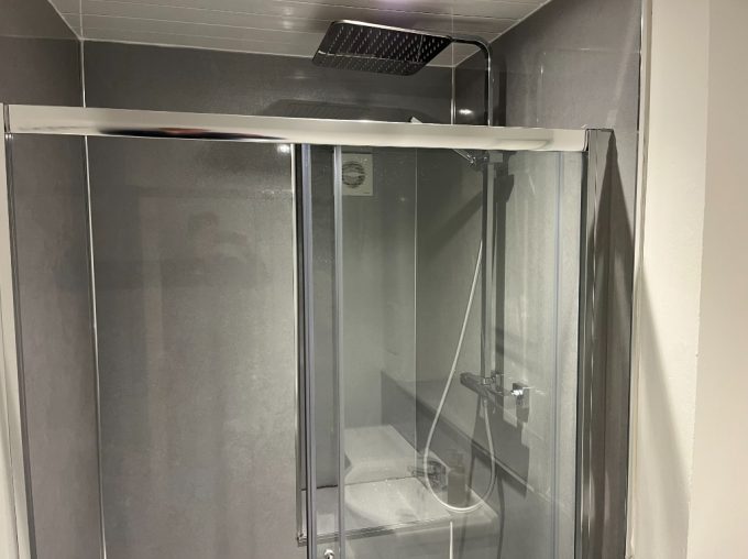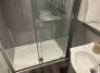 The modern shower room is fitted with a sleek suite and a vanity unit beneath the sink for convenient storage.