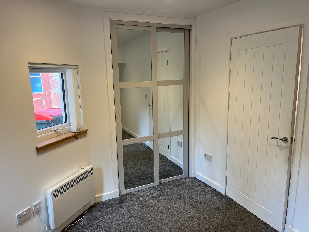 The double bedroom benefits from mirrored fitted wardrobes and direct access via a rear door leading out to a private courtyard area.