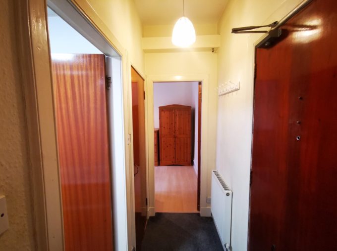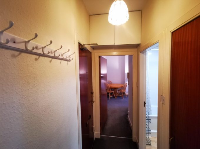 Welcoming entrance hallway with secure door entry system and a large storage cupboard, ideal for coats, cleaning equipment, or general storage.