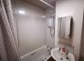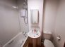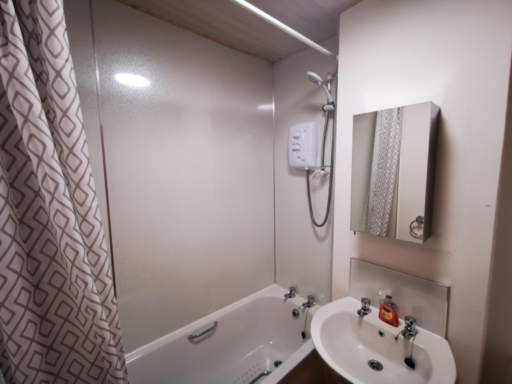 Fitted white bathroom suite with Triton T80 shower over bath and mirrored wall cabinet for storage.