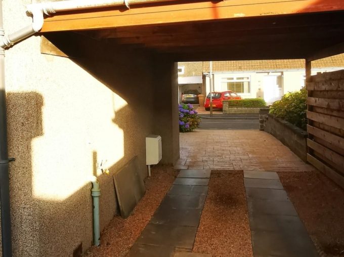 Easily maintained garden with cream flint chips and shrubs, a mono-block effect drive leading to carport and single garage to the rear.