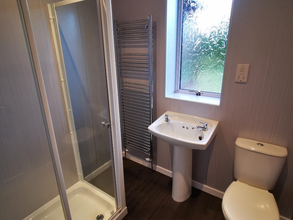 Finished in a clean and contemporary style with wet wall throughout and parador ceiling. Walk in shower with thermostatic controls.