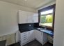 Modern kitchen with white units, grey worktops, and side door to garden and driveway
