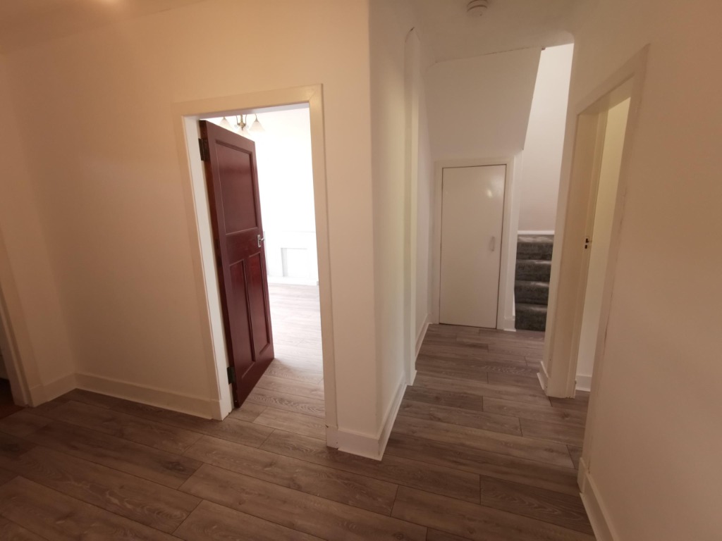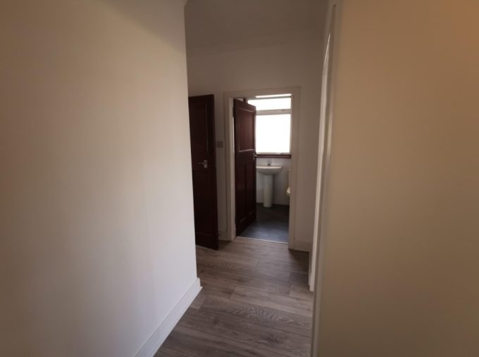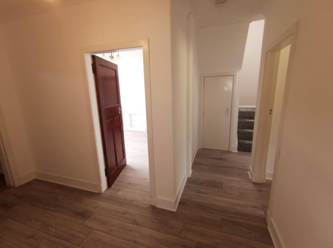 Entrance vestibule leading to bright hallway with new oak-style grey flooring