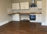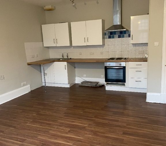 The property is accessed via a welcoming hallway leading to a large open-plan kitchen and living area, featuring attractive bay windows that provide a bright, sunny outlook. The kitchen is fitted with a Lamona oven and hob, offering practical and stylish cooking facilities.