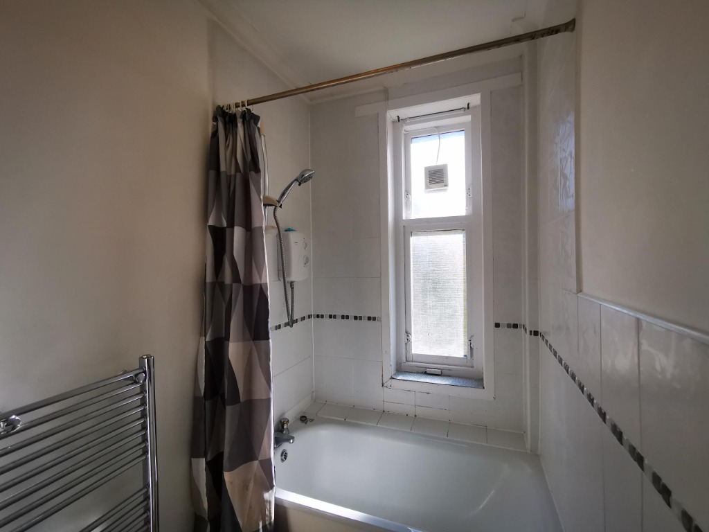 Bright, modern bathroom with partial tiled surround, fitted with a Triton Cara electric shower over the bath, pedestal wash hand basin, and WC.